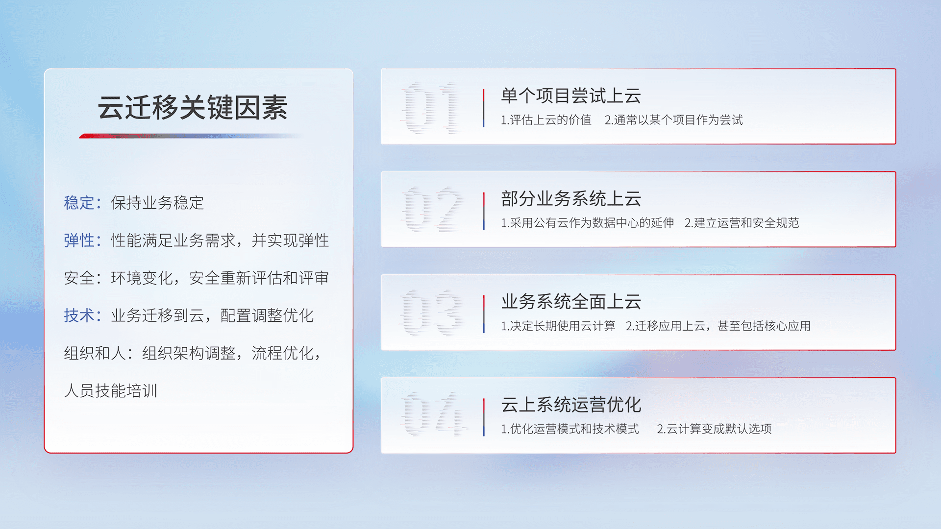 结合实际业务,,,,从规划设计、、、、云平台选型、、、云原生改造、、、数据迁移、、、集成交付,,,,迁移全过程为客户识别最佳上云路径,,,做好风险识别管理,,设计网络架构、、、、身份权限、、安全审计合规、、、、操作审计、、、日志审计、、、监控告警策略、、、、多站点容灾设计等,,,,对云上基础设施进行整体规划,,提升IT治理水平,,以满足弹性、、、高可用、、高性能的需求。。。