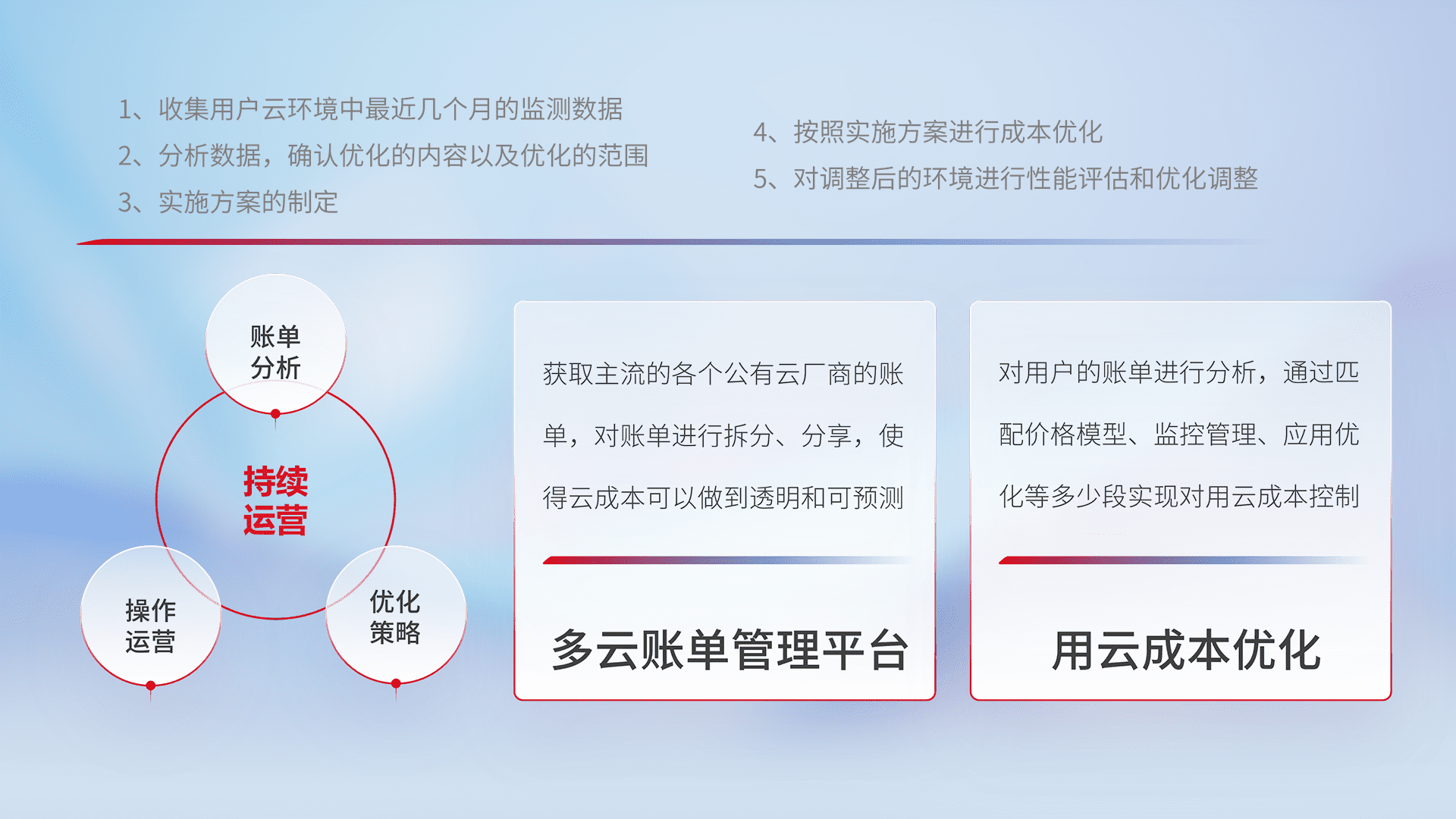 通过多云纳管,,,以统一的资源数据模型把客户的云资源进行抽象和封装,,,,进而实现对多云资源的统一操作,,保障云资源管理的可靠性、、、、稳定性与可用性。。。量身定制化运维内容,,配置、、开发运维、、、、补丁管理、、备份、、监控、、、认证和访问管理、、审计和日常巡检等,,,,保障在用云过程中的可靠度,,,稳定度以及高可用率。。。